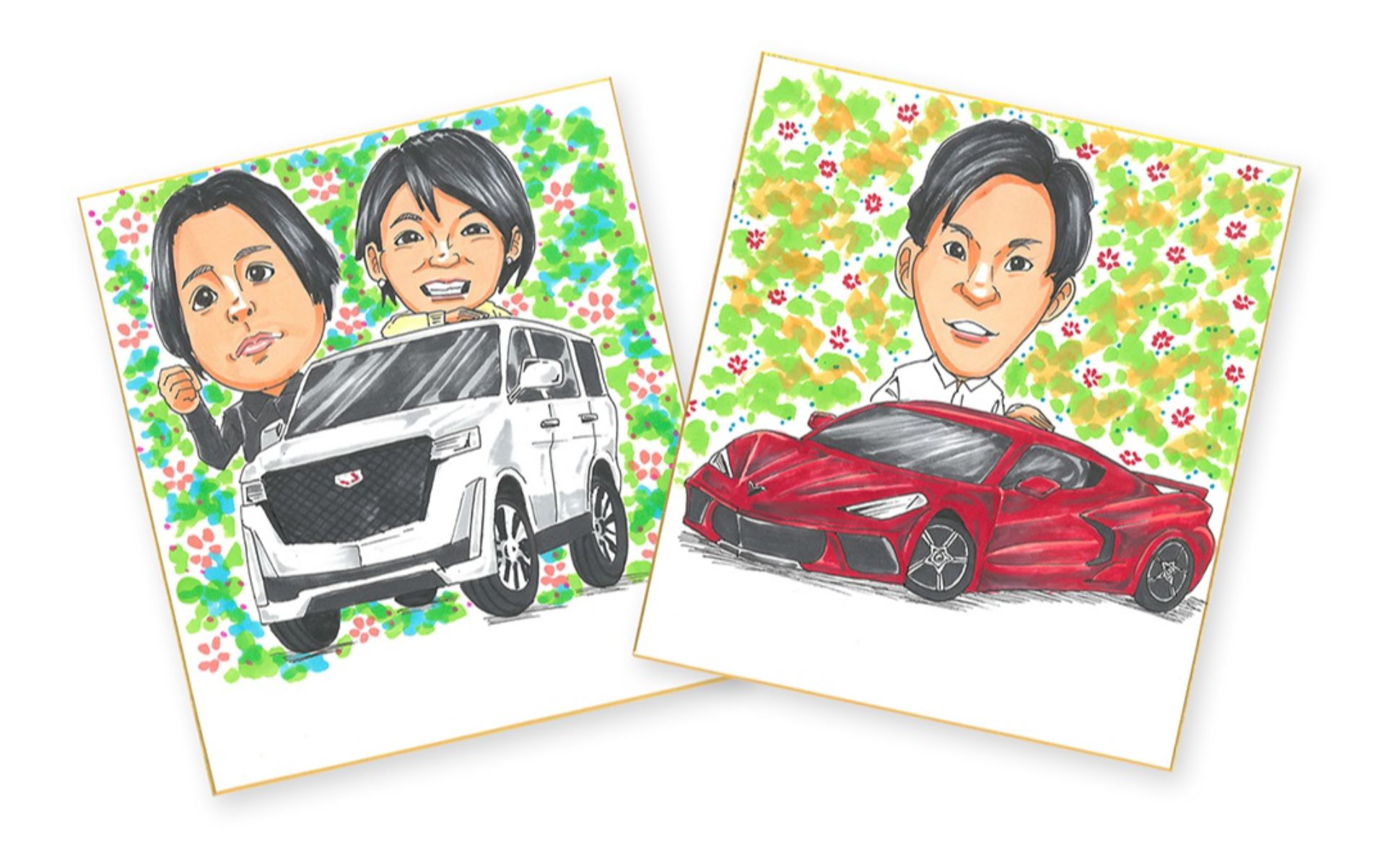 キャデラックまたはシボレーのモデルのイラストをベースに、プロの似顔絵師がオーナー様の似顔絵を描いて、その場でプレゼントいたします。
