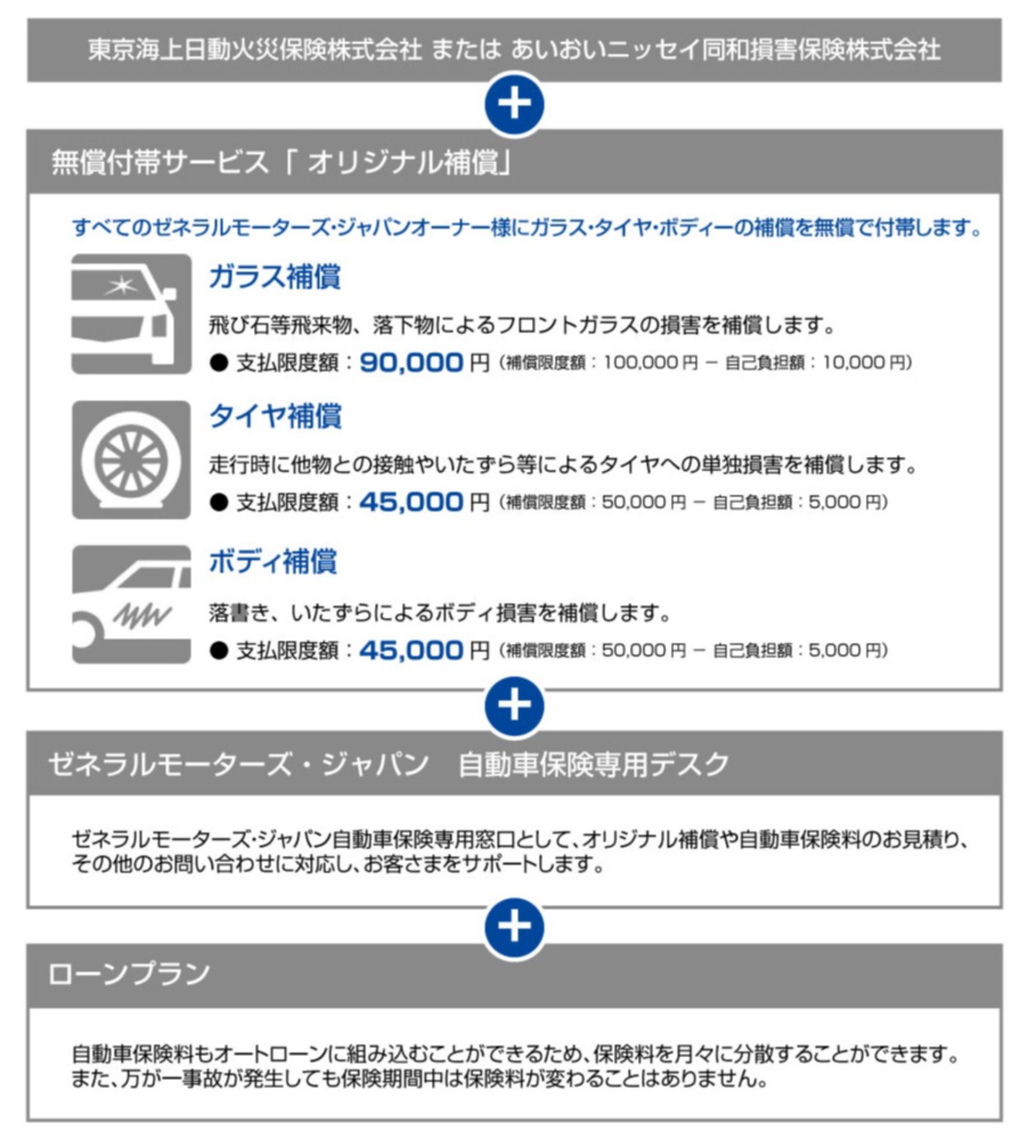「ゼネラルモーターズ・ジャパン自動車保険」は、キャデラック/シボレー正規ディーラーだけが扱う自動車保険プログラムで、新車/中古車を問わず損害保険会社の自動車保険に、ゼネラルモーターズ・ジャパンが提供する無償付帯サービス「オリジナル補償」をプラスしたものです。