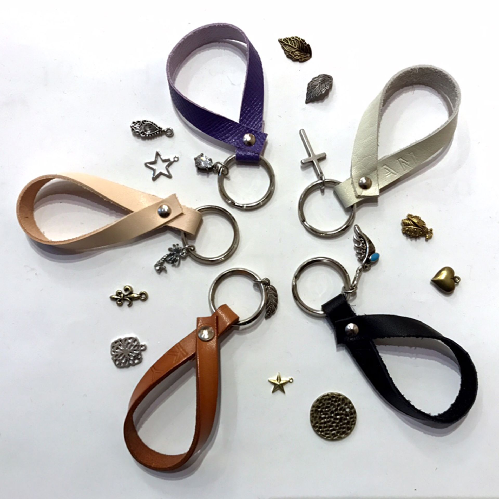 カシメを使って本革を加工し、キーホルダーを作ります。お好きなチャームを取り付けて完成!あなただけのオリジナルの作品が作れます。