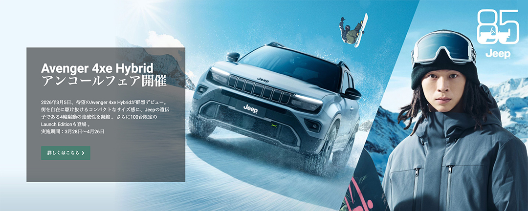 イベント/お知らせ 2026年3月7日 NEW! NEW Avenger 4xe Hybrid発売開始 2025年12月22日 年末年始休業のご案内 2025年6月26日 Renegade e-Hybirid デビューフェア 2025年6月6日 2025年5月1日よりAvenger、Commanderの価格を見直しました。 2025年4月1日 法定点検料金のご案内 キャンペーン 法定点検料金のご案内法定点検料金のご案内ジープ厚木 無料点検実施中 オフィシャルブログ ジープ 東名横浜 スタッフブログ ジープ 相模原 スタッフブログ ジープ 新百合ヶ丘 スタッフブログ ジープ 厚木 スタッフブログ ジープ 東名横浜 ジープ 相模原 ジープ 新百合ヶ丘 ジープ 厚木